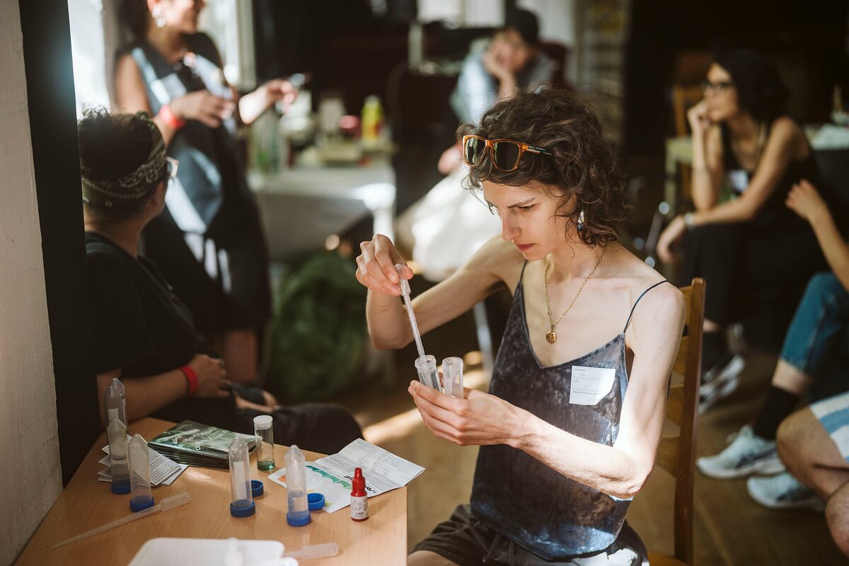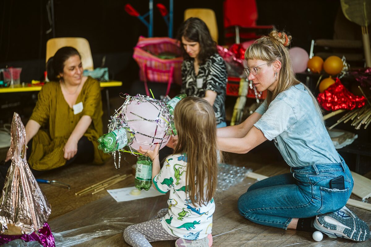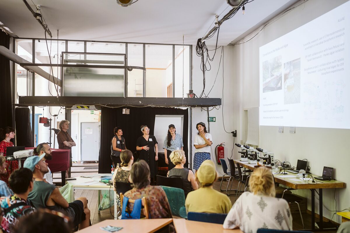Das Festival begann am Morgen des 21. Juni mit der Veranstaltung HYDRO ENCOUNTERS - BECOMING COMPANIONS unter der Leitung von Sybille Neumeyer (Künstlerin, Forscherin) und Fara Peluso (Biokünstlerin, Biodesignerin, Forscherin). Am Ufer der Panke entnahmen die Teilnehmer:innen Wasserproben aus dem Fluss und lasen über Erzählungen von Körpern aus und im Wasser – eine Einladung, Perspektiven auf Symbiose, mikrobielle Vielfalt und Wasser als gemeinsame Ressource zu erweitern. Im Anschluss an die Lesung traf sich das Publikum im Kulturzentrum PA 58 zum ersten Workshop AMPLIFYING RIVER COMMUNITIES mit Prof. Dr. India Mansour (Mikrobiologin, Rillig Lab | Ecologies of Plants, FU Berlin), Dr. Joana MacLean (Mikrobiologin, Rillig Lab | Ecologies of Plants, FU Berlin), Sybille Neumeyer (Künstlerin, Forscherin) und Fara Peluso (Bio-Künstlerin, Bio-Designerin, Forscherin). Dieser Workshop lud Menschen aller Altersgruppen dazu ein, die kleinsten Wasserbewohner der Panke mithilfe von Mikroskopen kennenzulernen und zu zeichnen. Die Zeichnungen dienten dann als Inspiration für Skulpturen von Algen und anderen Mikroorganismen, die vor Ort mit verschiedenen Materialien gebastelt wurden. Zusätzlich boten die Mitglieder von DIY Hack the Panke – Praktiker:innen mit verschiedenen Hintergründen in Kunst, Design und Wissenschaft - Breakout-Sessions zu einer Reihe von Themen, wie dem Anbau eigener Algen oder der Flussökologie, an.