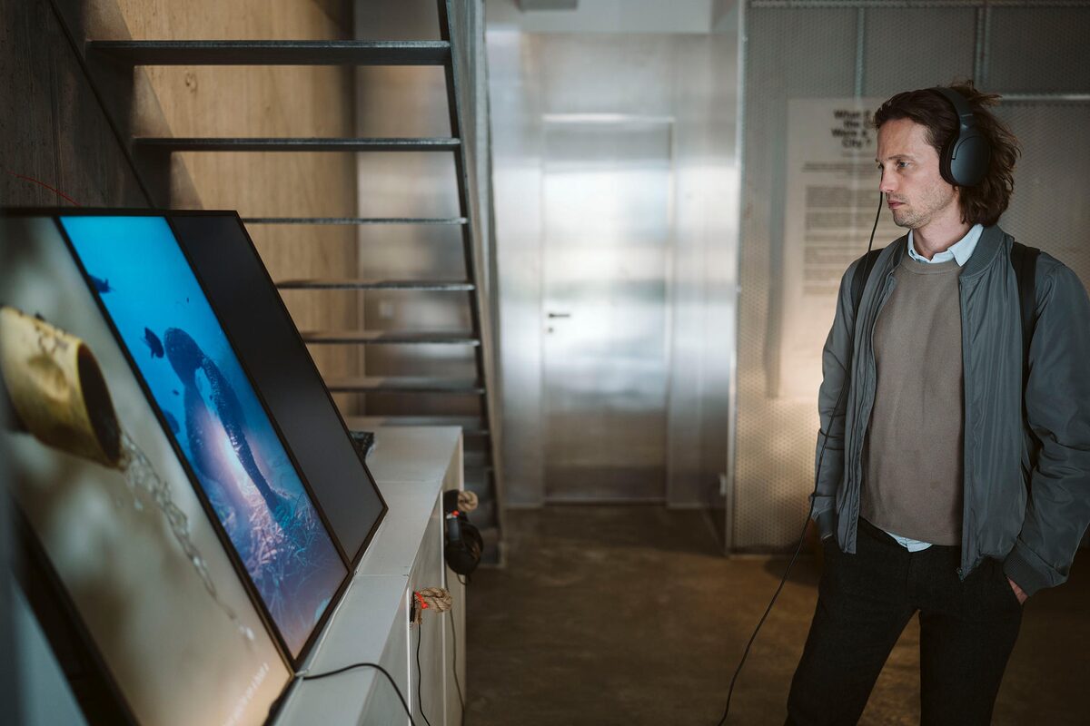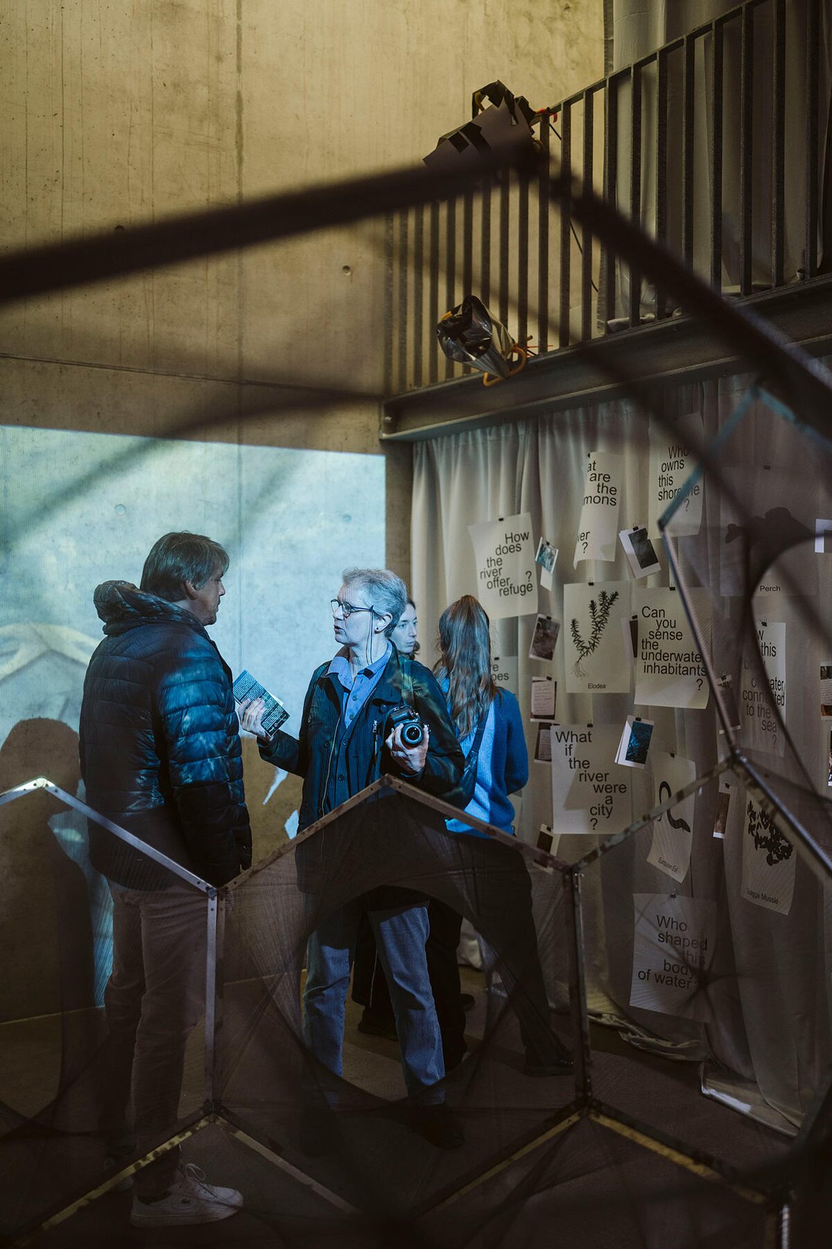 Die Reise begann am Vormittag mit einer Bootsfahrt vom Historischen Hafen in Berlin-Mitte zum Kaisersteg in Oberschöneweide. Auf dem Weg dorthin wurden erste Visionen für urbane Wasserlandschaften der Zukunft entwickelt. "Wir haben den Mars besser erforscht als die Unterwasserwelten auf der Erde", gab die Kuratorin und Gründerin des re:future lab, Madeleine Schwinge, zum Einstieg in das Programm zu bedenken. Der Ausgangspunkt der Diskussion an Bord rund um “Symbiotic Waterscapes: Discussing from an immersive design and science perspective” bot das Projekt Syntopolis – ein von Rasa Weber entwickeltes künstliches Riff, das in der Spree verankert wurde. In ihrer Keynote zeigte die Designforscherin und Taucherin, wie Design neue Formen des Zusammenlebens zwischen Mensch und aquatischem Leben initiieren kann. In der anschließenden Gesprächsrunde mit Prof. Dr. Robert Arlinghaus (HU Berlin & IGB) und Laurin Kilbert (Symbiotic Spaces) wurde deutlich: Zukunftsgestaltung braucht einen Perspektivwechsel – und Design kann eine Brücke zwischen Wissenschaft, Natur und Gesellschaft schlagen. Eine Live-Unterwasserübertragung aus dem künstlichen Riff, das aus natürlichen Materialien geformt wurde, bot den Teilnehmer*innen zudem seltene Einblicke in die Lebenswelt unter der Wasseroberfläche.