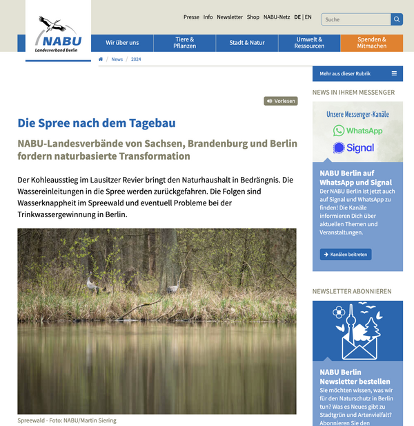 Ein zentrales Diskussionsthema ist der Wassermangel in der Spree, der mit dem Ausstieg aus der Braunkohleförderung in der Lausitz in Zusammenhang steht. Der NABU Berlin betont, dass mit dem Ende des Tagebaus die bisherige Einspeisung von Grundwasser in die Spree stark reduziert werde. Diese Entwicklung verschärfe die ohnehin angespannte Wassersituation in der Region und habe auch Auswirkungen auf die Wasserverfügbarkeit in Berlin.