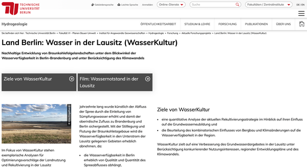Das Kompetenzzentrum Natürlicher Klimaschutz bietet Informationsangebote und Förderberatungen für Flächeneigentümer:innen an, um Böden besser vor Erosion zu schützen und Wasserspeicherung zu ermöglichen. Insbesondere mit Blick auf Brandenburg werden Folgen von Trockenheit für die Landwirtschaft diskutiert. Die TU fällt hier durch Forschungsartikel oder das bis 2024 bestehende “WasserKultur”-Projekt auf, das exemplarische Analysen für Optimierungsvorschläge der Landnutzung und Rekultivierung in der Lausitz erforschte.