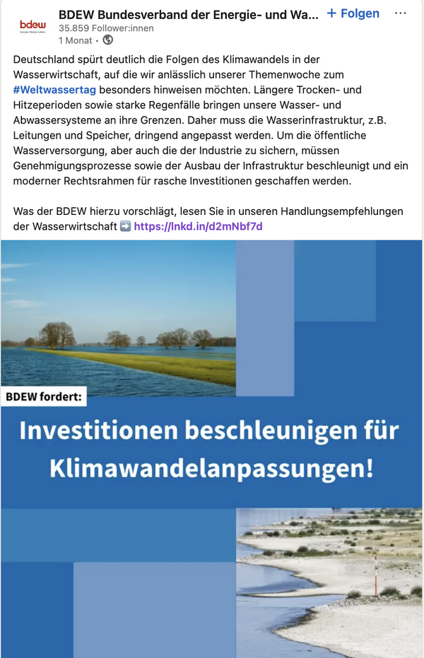 BDEW fordert Maßnahmen zu Klimawandelanpassungen [LinkedIn]