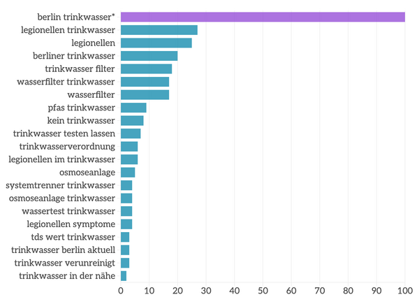Häufigste Google-Suchanfragen in Verwandtschaft mit "Trinkwasser" in Berlin im Zeitraum 02.04.2024 bis 02.04.2025. *Die Werte geben die Häufigkeit der Suchanfragen in Relation zum ersten Wert an. Die 100 bezeichnet dabei den Ausgangswert der Suchhäufigkeit, sodass “legionellen trinkwasser” an zweiter Stelle 0,27 mal so häufig gesucht wurden wir die Ausgangssuche.